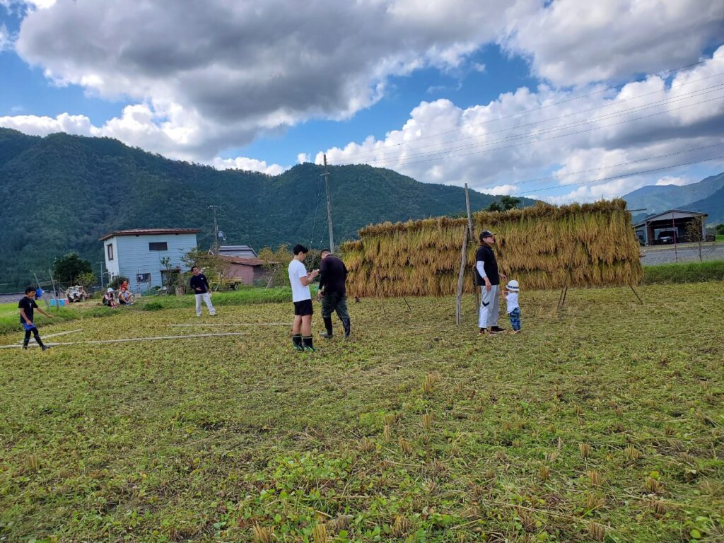 協力業者や家族をお呼びして皆で協力しながら現地の田んぼ約1.3反の米作りを行っています。