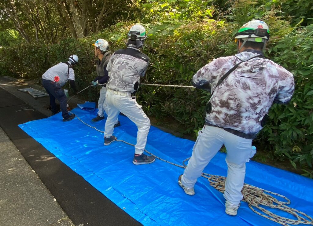 現場では大勢の人間が声を合わせ、せーのせーのとケーブルを引っ張っていきます。