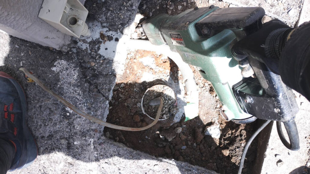 ですが、思った以上に斫りに苦戦し1日では建てるのは難しいと判断し、私たちは古いポールだけでも抜くことに集中しました。そして丸1日基礎を斫り続け、何とか古いポールライトを抜くことができました。
