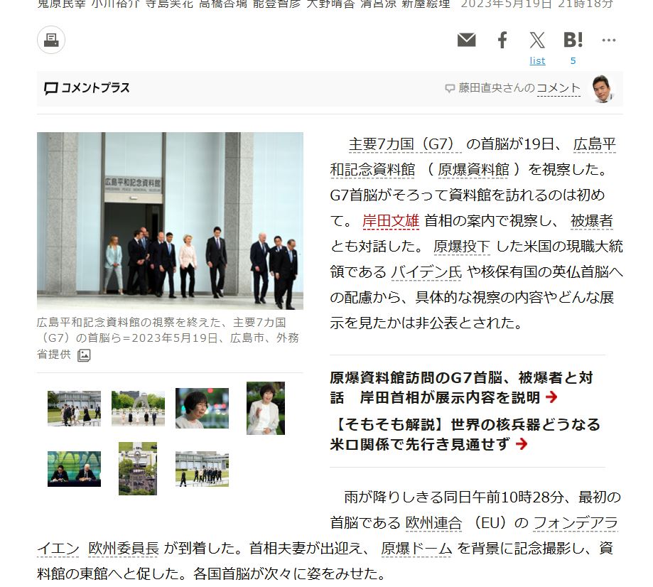 各国首脳は、広島の平和記念公園を訪れ、更に原爆資料館を見学したと報道されておりました。そこまでのお話は事実でありますが、ボランティアの方のお話、現在検索でWEB上で出てくる写真や記事からは、資料館本館を見学したとは出てきませんし、何を観たのかも伏せられております。