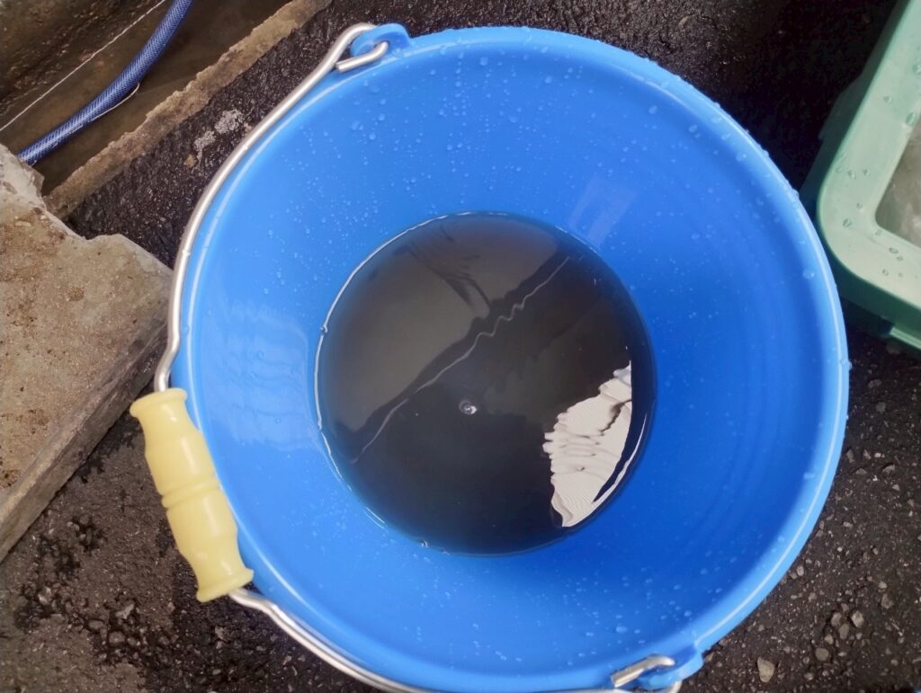 洗浄で出た汚水は埃や黒カビの汚れで真っ黒で、キラキラした破片の様子から銅の錆も見て取れます。